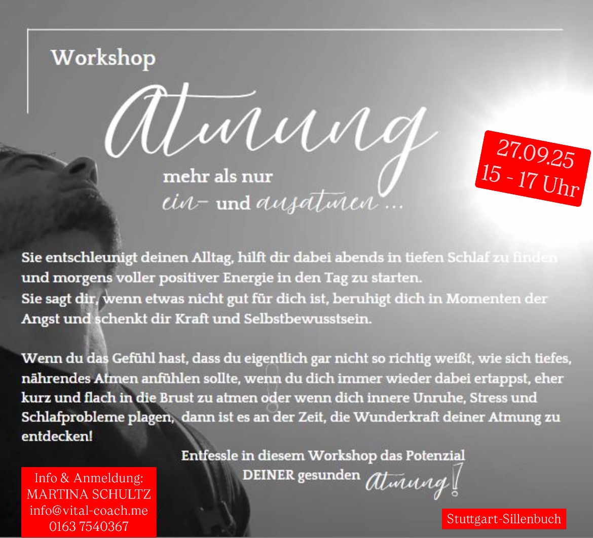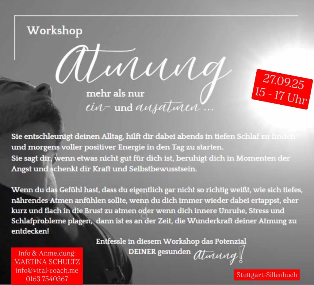 Workshop ATMUNG – mehr als nur ein- und ausatmen 27.09.25 in Sillenbuch Workshop ATMUNG – mehr als nur ein- und ausatmen 27.09.25 in Sillenbuch 7. August 2025 Martina Schultz Alle Info findest zu diesem Workshop findest du hier …